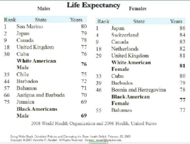 30. Based on international comparisons of life expectancy, the quality of life for black American males and females is worse than males and females in several so-called developing countries, including Chile, Barbados, Cuba and Jamaica. That is if black American men’s life expectancy were ranked as a country at 69 years old, black males ranked 75th behind Jamaica; black women ranked 55th behind Bosnia and similar to Jamaica. [13] This ranking is 45 points lower than white males and 20 points lower than white females. The burden that is being carried by Descendants of Africans Enslaved in the United States (DAEUS) is unknown because the United States does not collect data specific to our status.