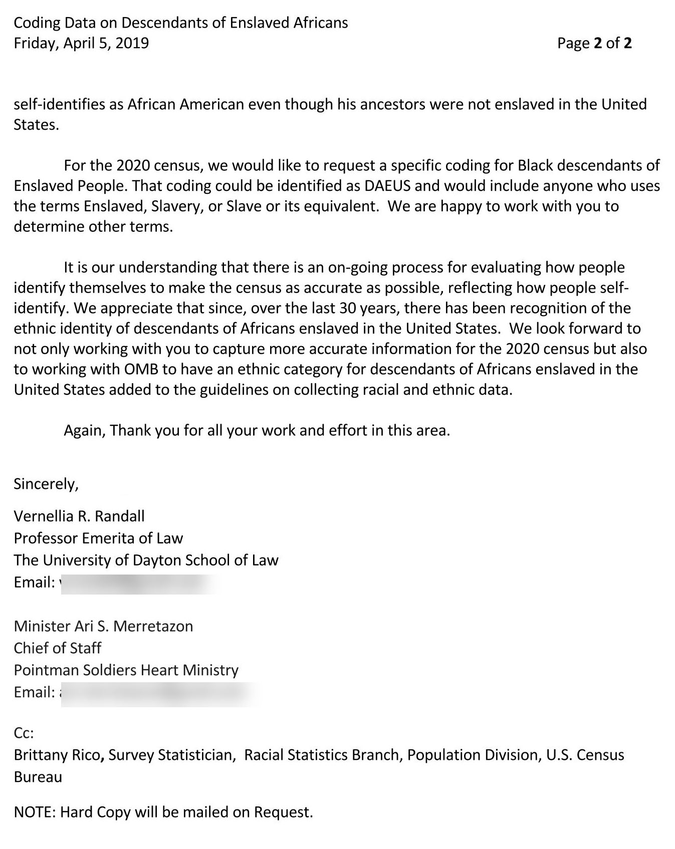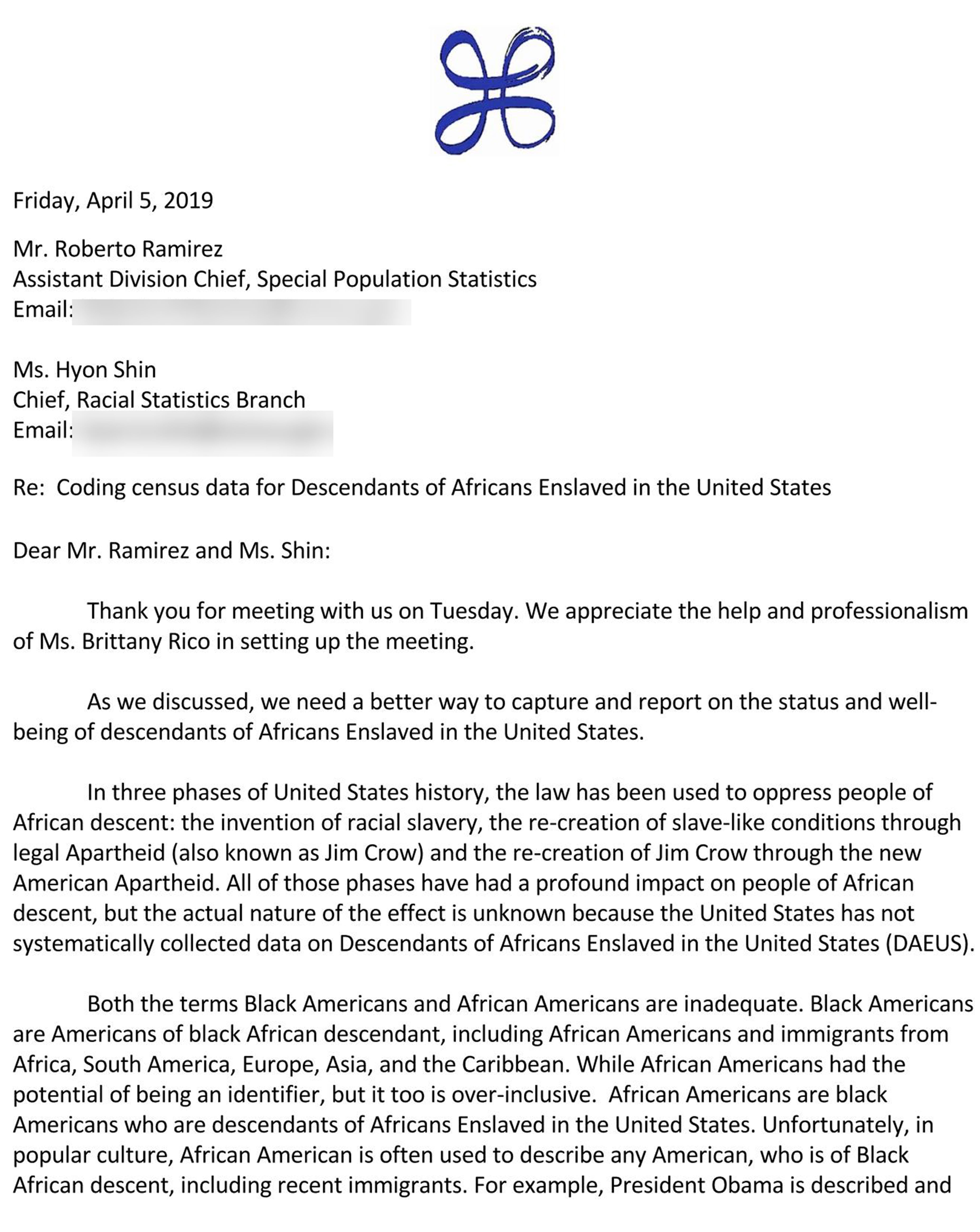 Attached is our letter requesting coding of census data for Descendants of Africans Enslaved in the United States